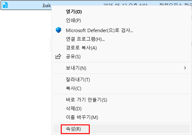 다음 보기 싫은 아이콘으로 변해있는 bak 파일을 우클릭하여 속성을 누릅니다.