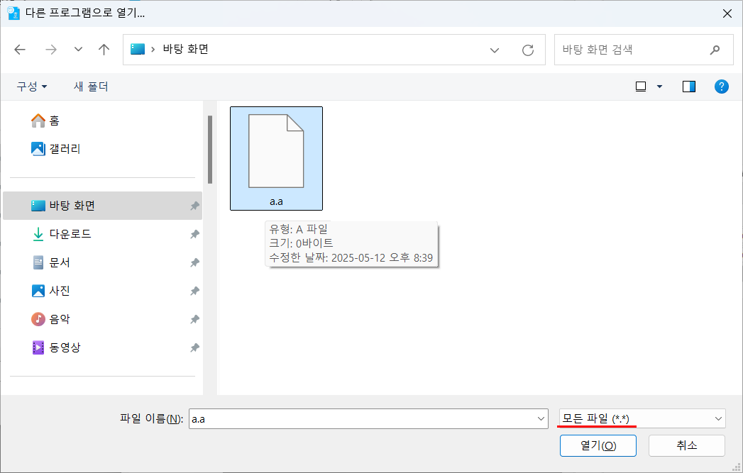 파일 유형을 모든 파일 (*.*) 로 선택하면 앞서 바탕화면에서 만든 a.a 파일이 보이게 됩니다.